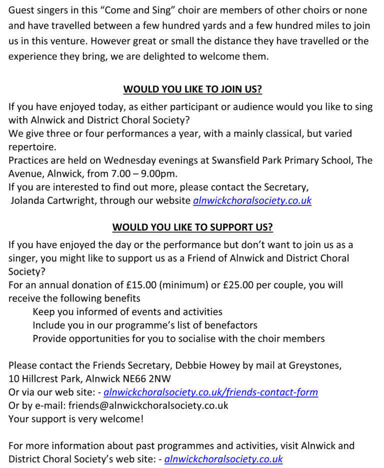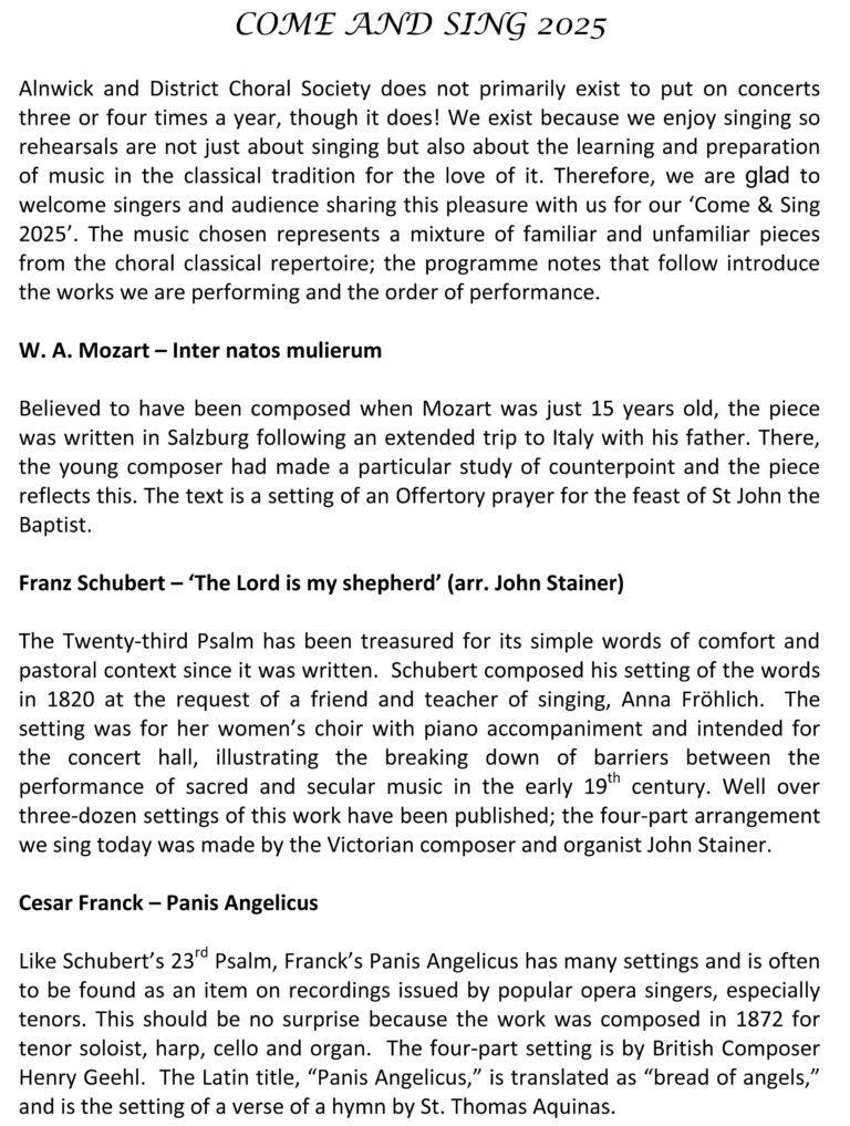 From my own perspective the concept of a “Come and Sing” while obviously taking the music and direction seriously, is more about really enjoying the singing and the experience of singing wonderful music, than fretting over the occasional (??!!) wrong note.