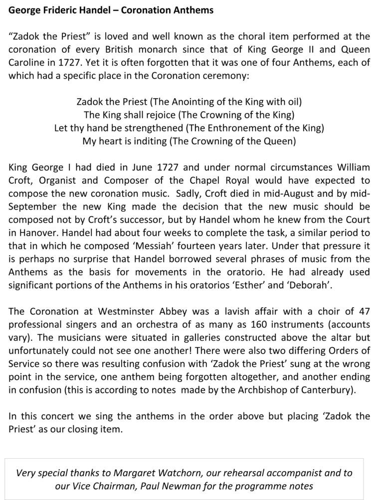 We began the concert with music that, though not always well known, gave us the confidence to move forward to the main work of Handel’s ‘Coronation Anthems’, and I’m sure if Handel had been in our audience, he may well have not only been proud that after 300 years his music had been chosen to be performed, and if the stories about the chaos of the original performance are correct, this rendition was much improved and still enjoyed by singers and audience alike.