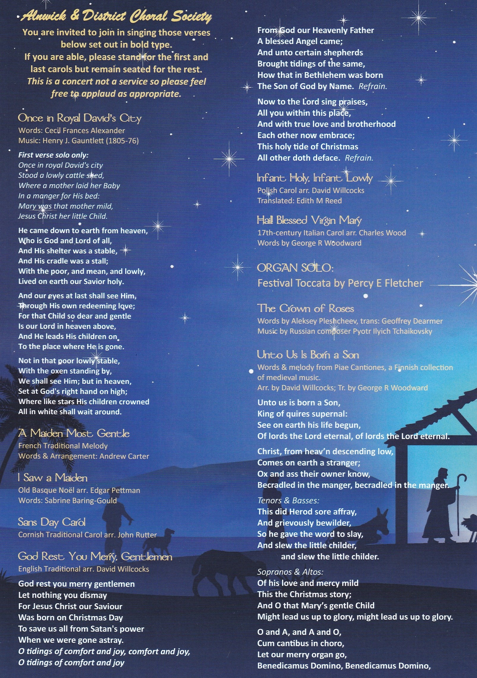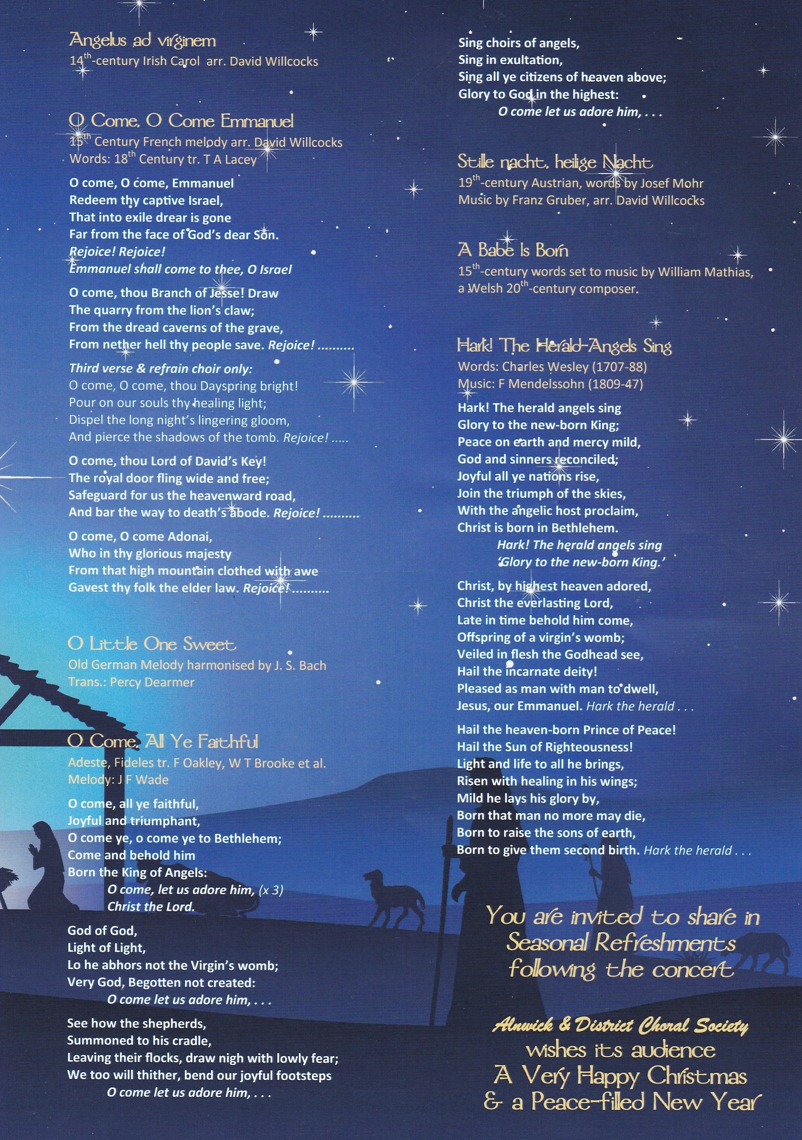 It was lovely to chat and catch up over mince pies: thank you to everyone who helped prepare and serve the refreshments and to those who took care of the raffle and tickets. I would also like to thank Alan Gidney for his excellent organ accompaniment and his solo ‘Interlude on Coventry Carol’. Lastly, thank you to our outstanding musical director, Peter Brown for bringing it all together.
