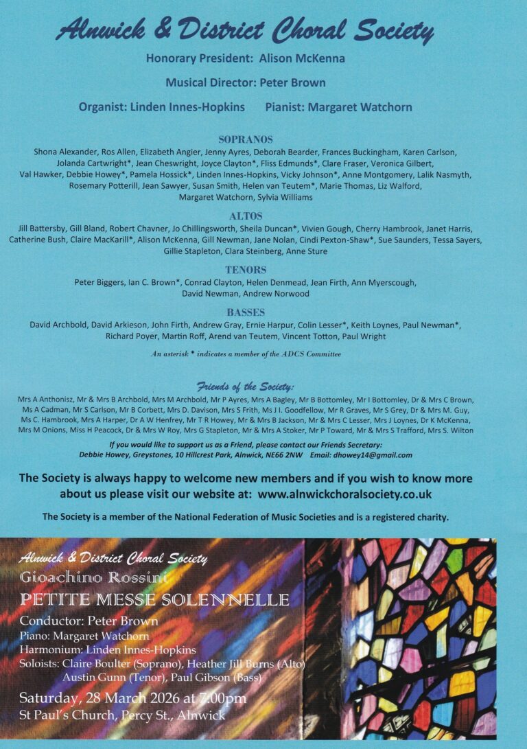 A personal review of the end of year concert given by Alnwick and District Choral Society and guests (June 21st 2025, St Paul’s Church).