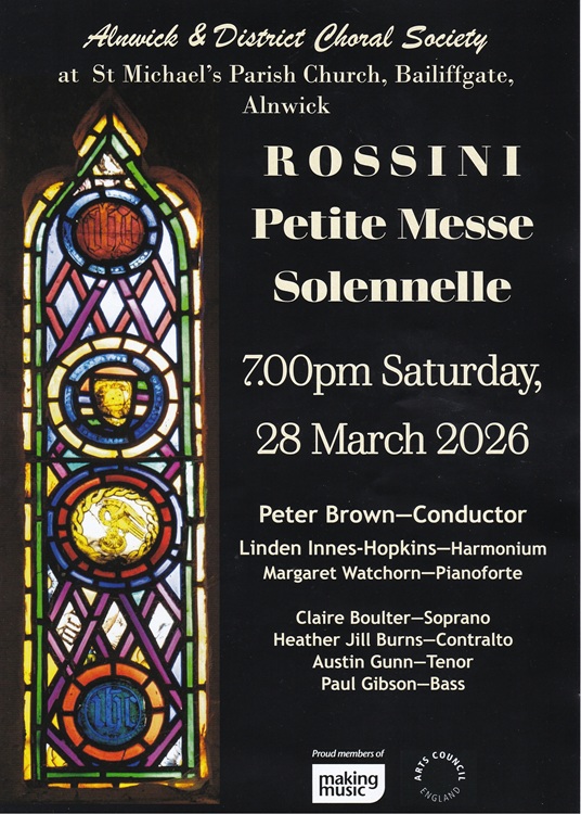 This Spring ADCS sang in St Michael’s Church, Alnwick for the first time. It was a great venue. Rossini’s ‘Petite Messe Solennelle’ has real emotional impact
